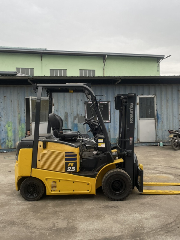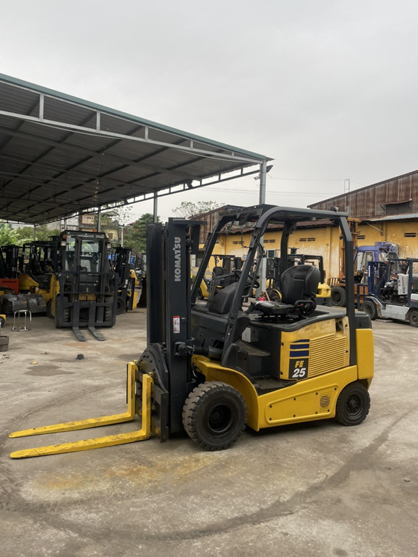 Xe nâng điện 2.5 tấn bình khô sạc nhanh Komatsu FE25-1, lốp đặc, sản xuất 2018. Là dòng xe nâng điện pin khô đời mới, được sản xuất để thay thế cho dòng xe dầu của hãng Komatsu
