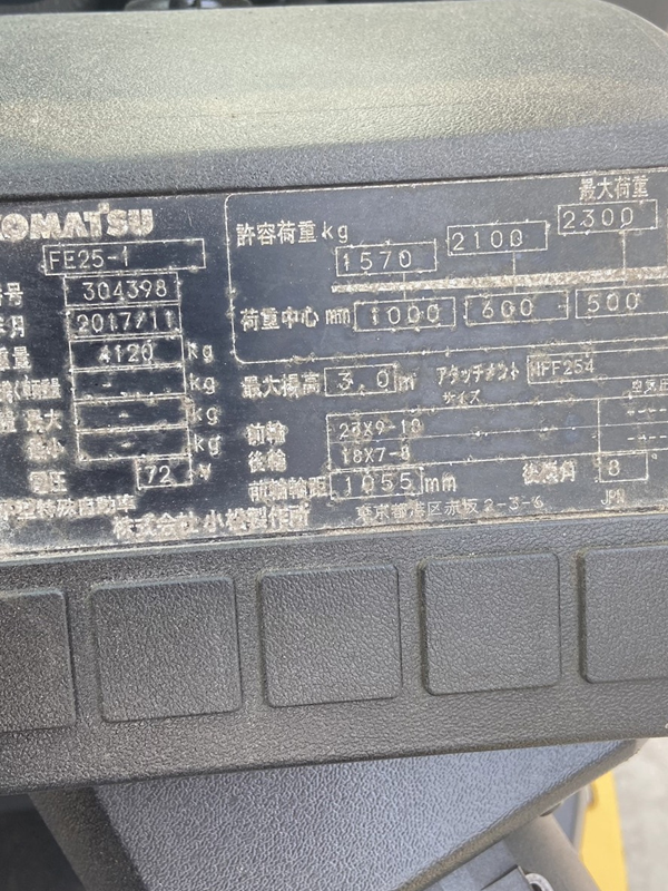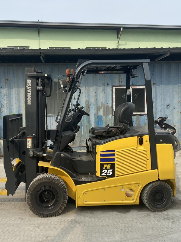 Xe nâng điện 2,5 tấn bình khô sạc nhanh Komatsu FE25-1, lốp đặc, chức năng gật gù, sản xuất 2017. Là dòng xe nâng điện pin khô đời mới, được sản xuất và nhập khẩu chính hãng Komatsu Nhật Bản
