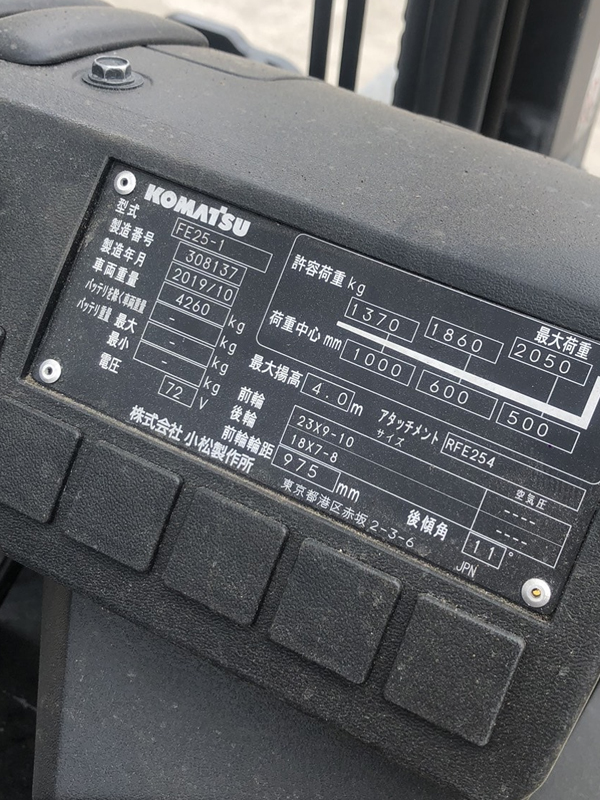 Xe nâng điện Komatsu 2,5 tấn bình khô sạc nhanh FE25-1 lốp đặc, chức năng gật gù, sản xuất 2019. Là dòng xe nâng điện pin khô đời mới.