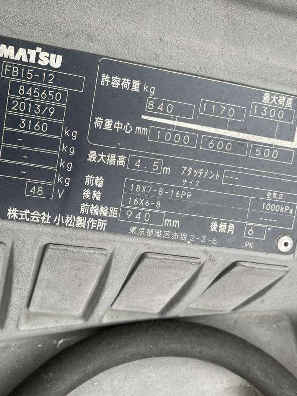 Xe nâng điện ngồi lái 1,5 tấn Komatsu FB15-12, sản xuất 2013, lốp đặc, nâng cao 4,5m, được sản xuất để sử dụng nguồn nhiên liệu sạch, không gây ô nhiễm không khí, tiếng ồn. Phù hợp sử dụng trong lĩnh vực sản xuất thực phẩm, đồ gia dụng,….